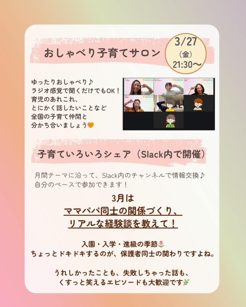 Slack・Zoomイベントともに、今月もメンバーさまと楽しみながら交流できると嬉しいです♪
